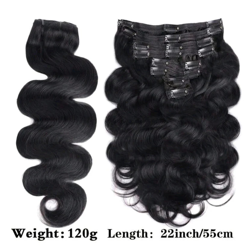 Transform your look with our Black wave clip-in 18Inch human hair extensions. Made from high quality, 100% human hair, these clip-ins add instant length and volume to your hair. Expertly crafted with a natural wave pattern, these extensions are easy to apply and provide a seamless blend for a flawless finish. Take your hair game to the next level with our Black wave clip-in human hair extensions.